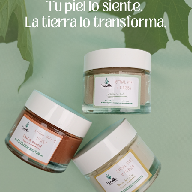 Ritual de Vitalidad - Arcilla Roja: pie madura, apagada, cansada. Despierta la energía que vive en la piel. Una dosis de tierra cálida y luminosa para reconectar con tu fuerza. Respira tu Piel - Arcilla Verde: Piel grasa o con impurezas.. Una pausa fresca para liberar, purificar y dejar que la piel se exprese sin peso ni exceso. Abrazo de Calma - arcilla blanca: Piel sensible y seca. Porque es suave, tierna y cuida como un mimo. Ideal para reconectar con la piel sensible desde el amor.